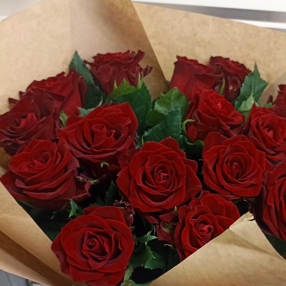 Букет из 15 красных роз Ред Наоми длиной 60 см в упаковке крафт